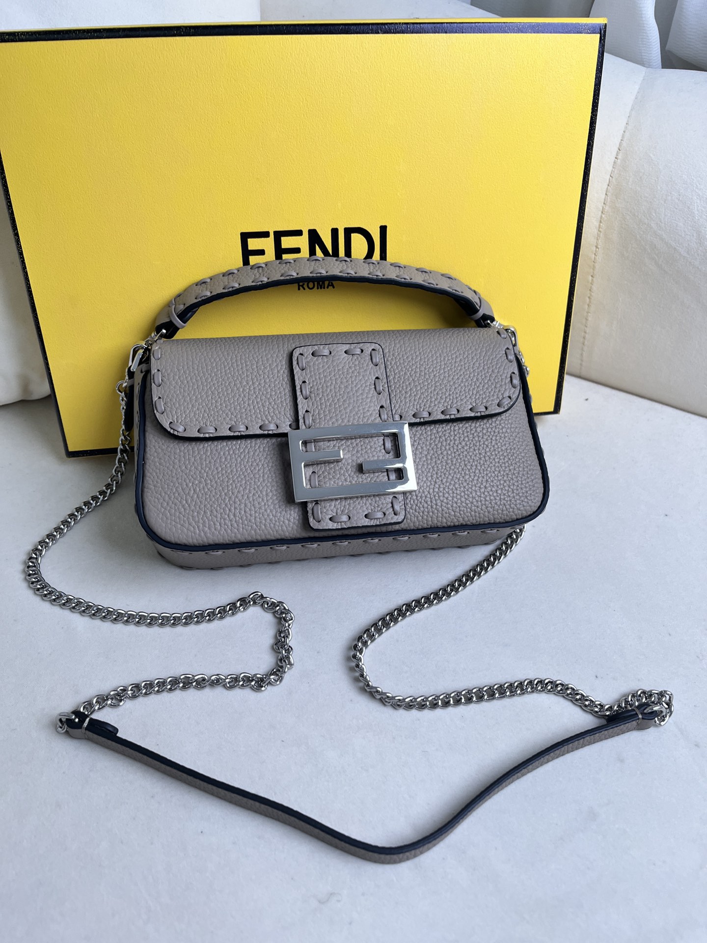 Tags: Designer Chain Bag, Dove Gray Shoulder Bag, Fendi Baguette Bag, Hand Stitched Leather Bag, Luxury Handbag