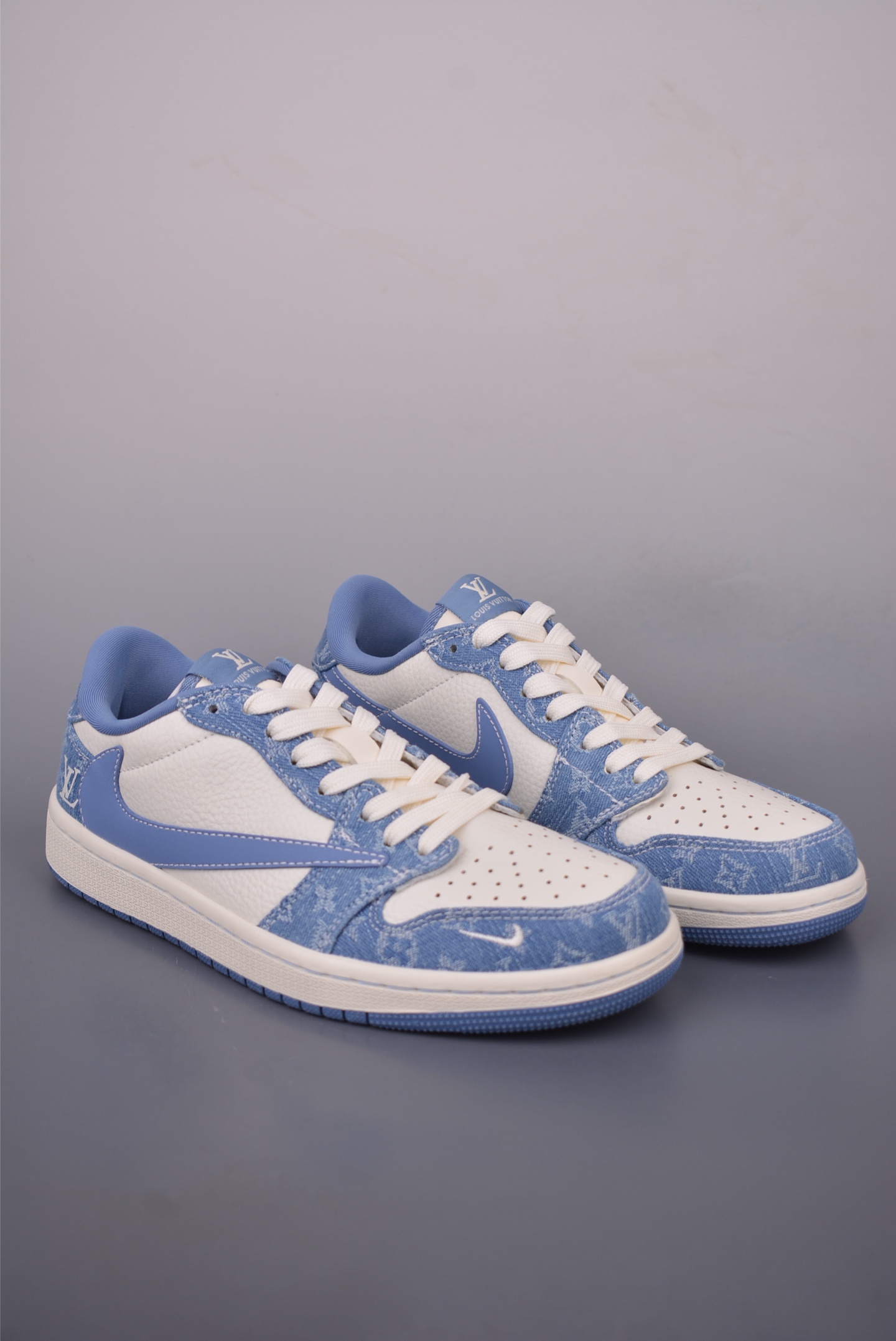 These Louis Vuitton x Air Jordan 1 Low sneakers are a stylish addition to any wardrobe. The sky blue color and quality leather make them stand out.